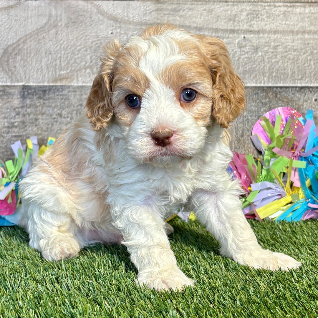 Hi, I’m Dion! I’m a 5-week-old male Cavapoo. My dad is a Cavalier King Charles Spaniel and my mom is a Poodle. I have a beautiful apricot & white coat, and I was born on January 17. I’ll be ready to go home to my forever family after March 19, once I’m grown enough to leave my litter. When I reach my adult size, I should weigh between 12–16 lbs. If a sock goes missing, I might be the culprit. I love mischief.