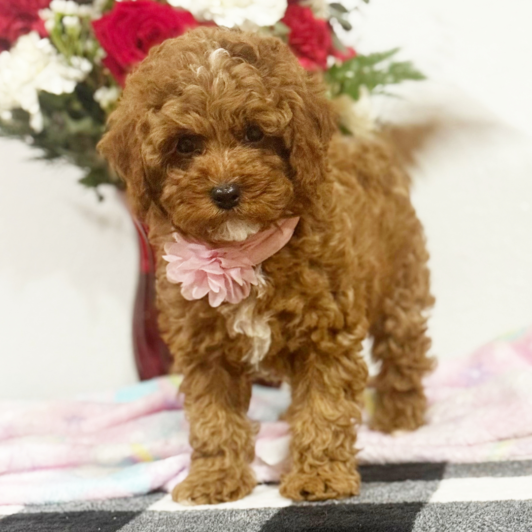 Hi, I’m Forever! I’m an 8-week-old female Cavapoo. My dad is a Poodle and my mom is a Cavapoo. I have a beautiful red coat, and I was born on December 22. I am ready now to plan my trip to my forever family. Once I reach my adult size, I’m expected to weigh between 8–9 lbs. Make me the newest member and I will be sure to have puppy kisses waiting just for you.