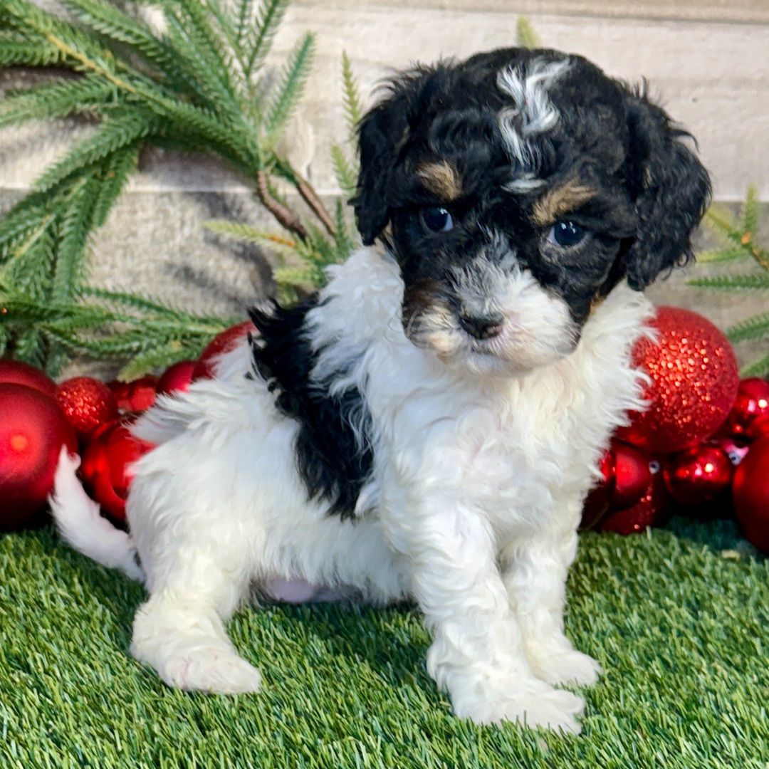Hi, I’m Klaire! I’m a 6-week-old female Cavapoo. My dad is a Poodle and my mom is a Cavapoo. I have a beautiful black, white & tan coat, and I was born on November 4, which makes me a Scorpio sign. I’ll be ready to go home to my forever family after December 31, once I’m grown enough to leave my litter. When I reach my adult size, I should weigh between 6–16 lbs. I’m looking forward to all our future cuddles and adventures.