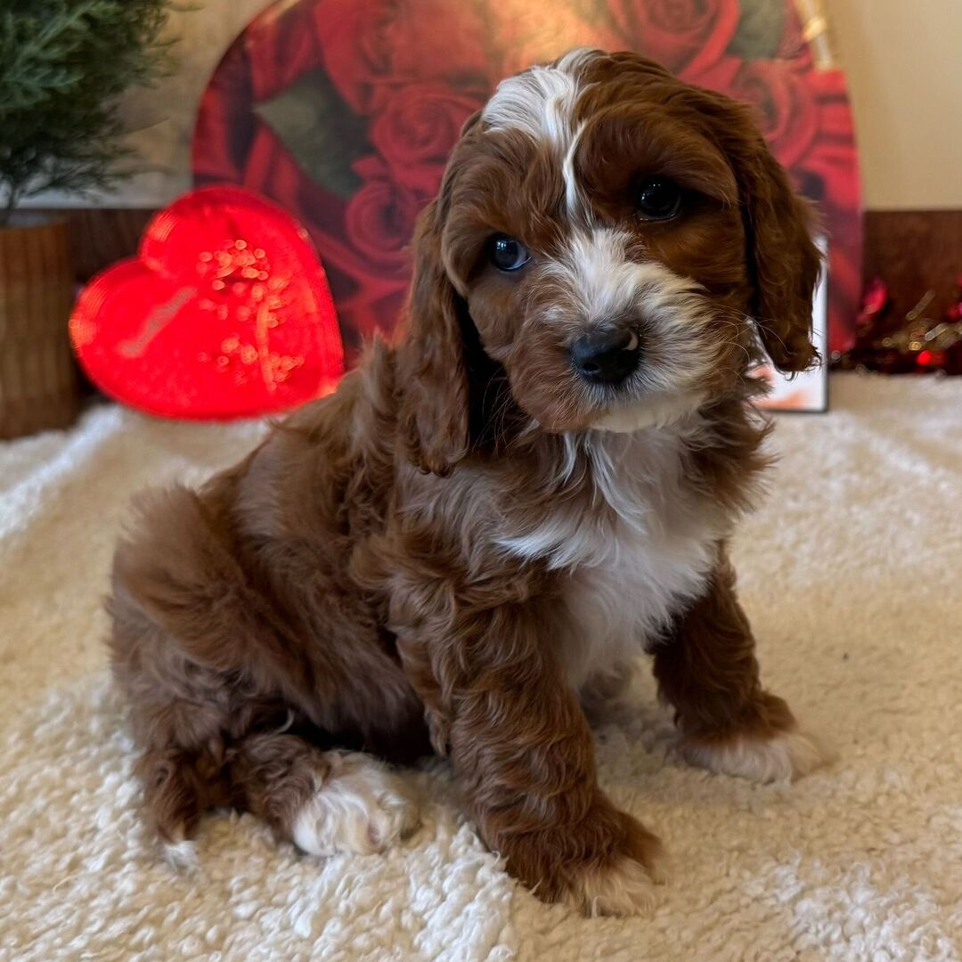 Hi, I’m Peyton! I’m a 9-week-old male Cavapoo. My dad is a Poodle and my mom is a Cavalier King Charles Spaniel. I have a beautiful red coat, and I was born on December 11. I am ready now to plan my trip to my forever family. Once I reach my adult size, I’m expected to weigh between 10–14 lbs. My playful spirit will bring joy and laughter to your home.