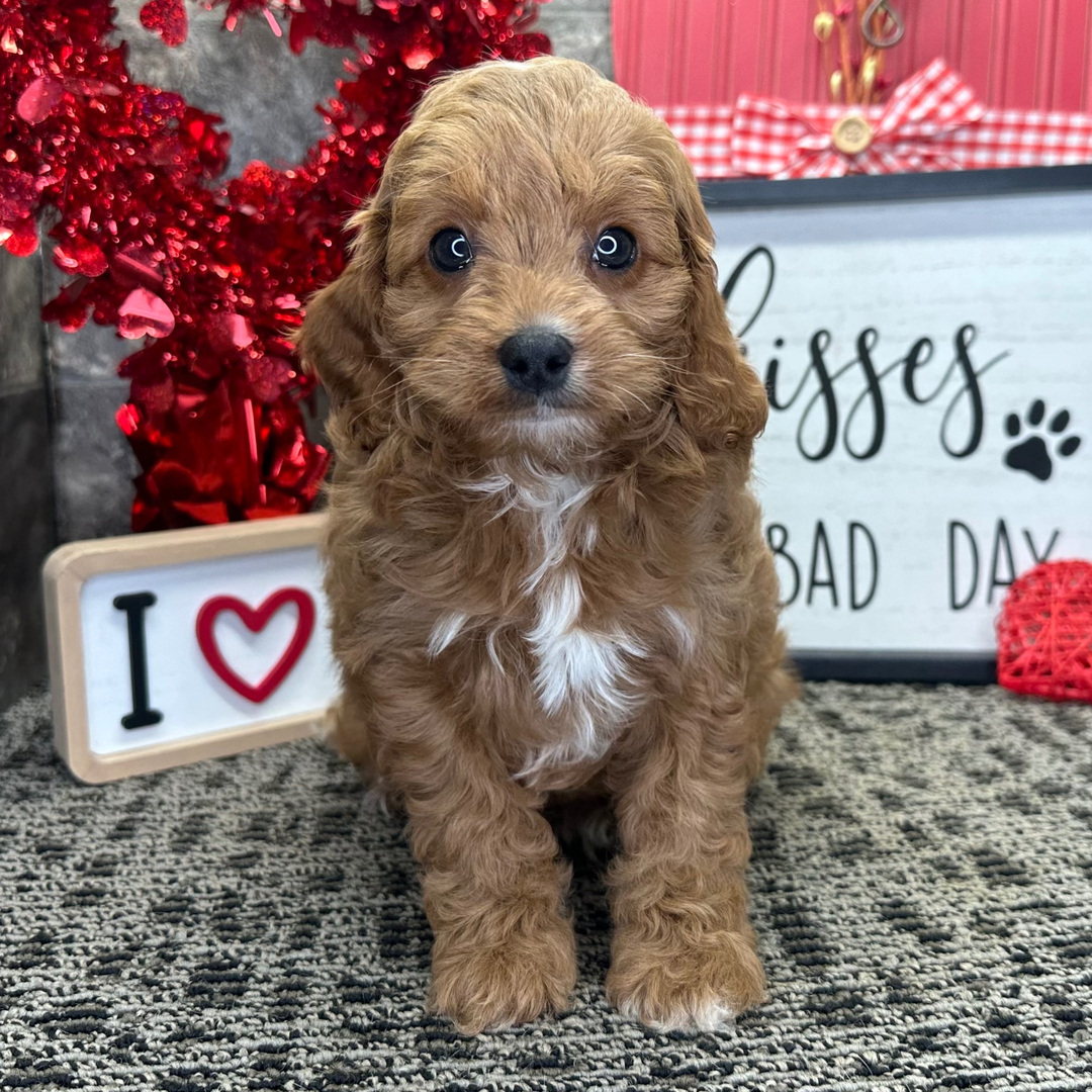 Hi, I’m Racer! I’m a 9-week-old male Cavapoo. My dad is a Poodle and my mom is a Cavalier King Charles Spaniel. I have a beautiful red coat, and I was born on December 10. I am ready now to plan my trip to my forever family. Once I reach my adult size, I’m expected to weigh between 8–22 lbs. My puppy love is ready to brighten your every day.